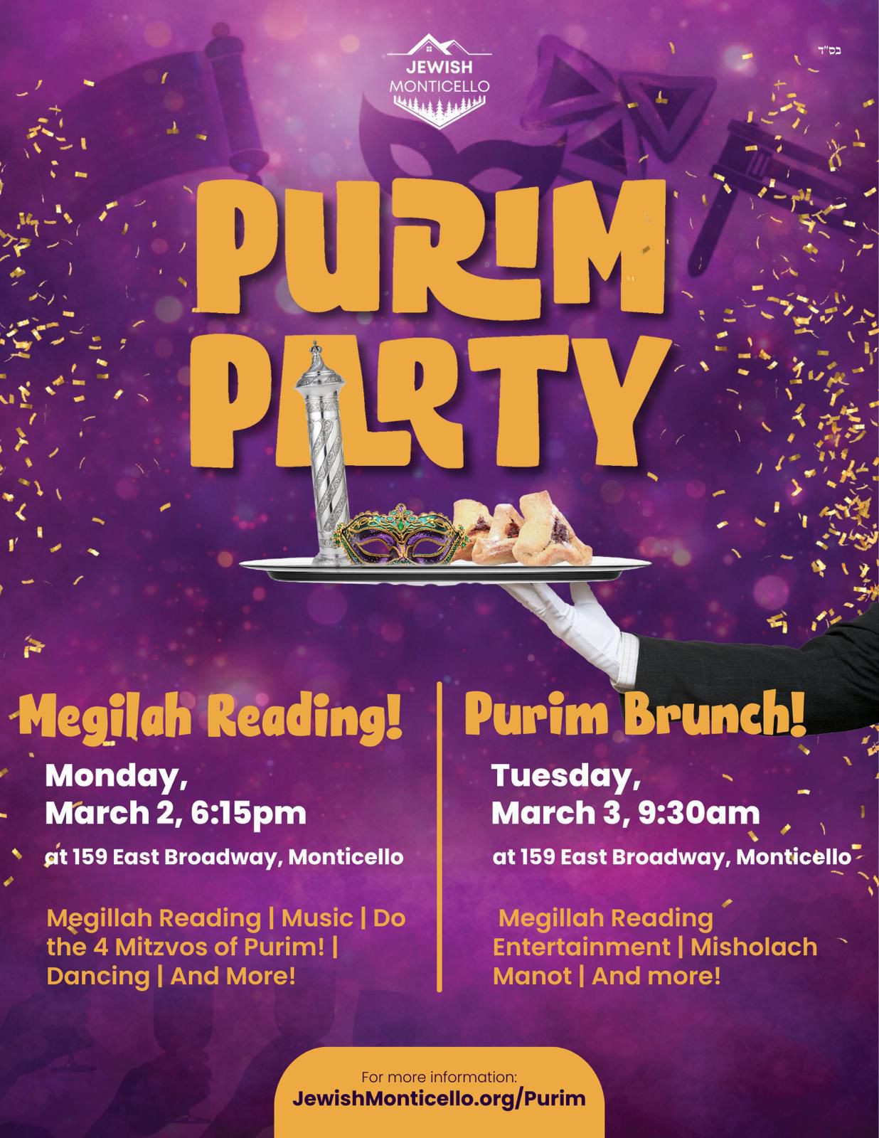 Join us for two amazing Purim events. Monday, March 2 @ 6:15pm for a Megillah Reading. Tuesday, March 3 @ 9:30am for a Purim Brunch! Both events at 159 East Broadway, Monticello NY